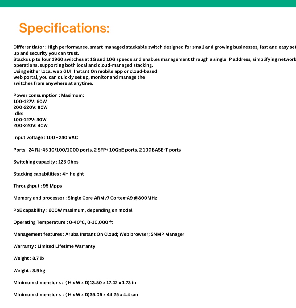 HPE Aruba Instant On 1960 24G 2XGT 2SFP+ Switch (JL806A)